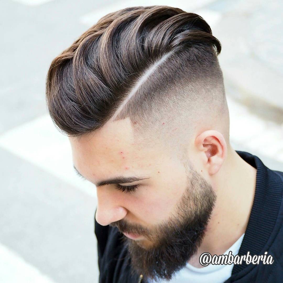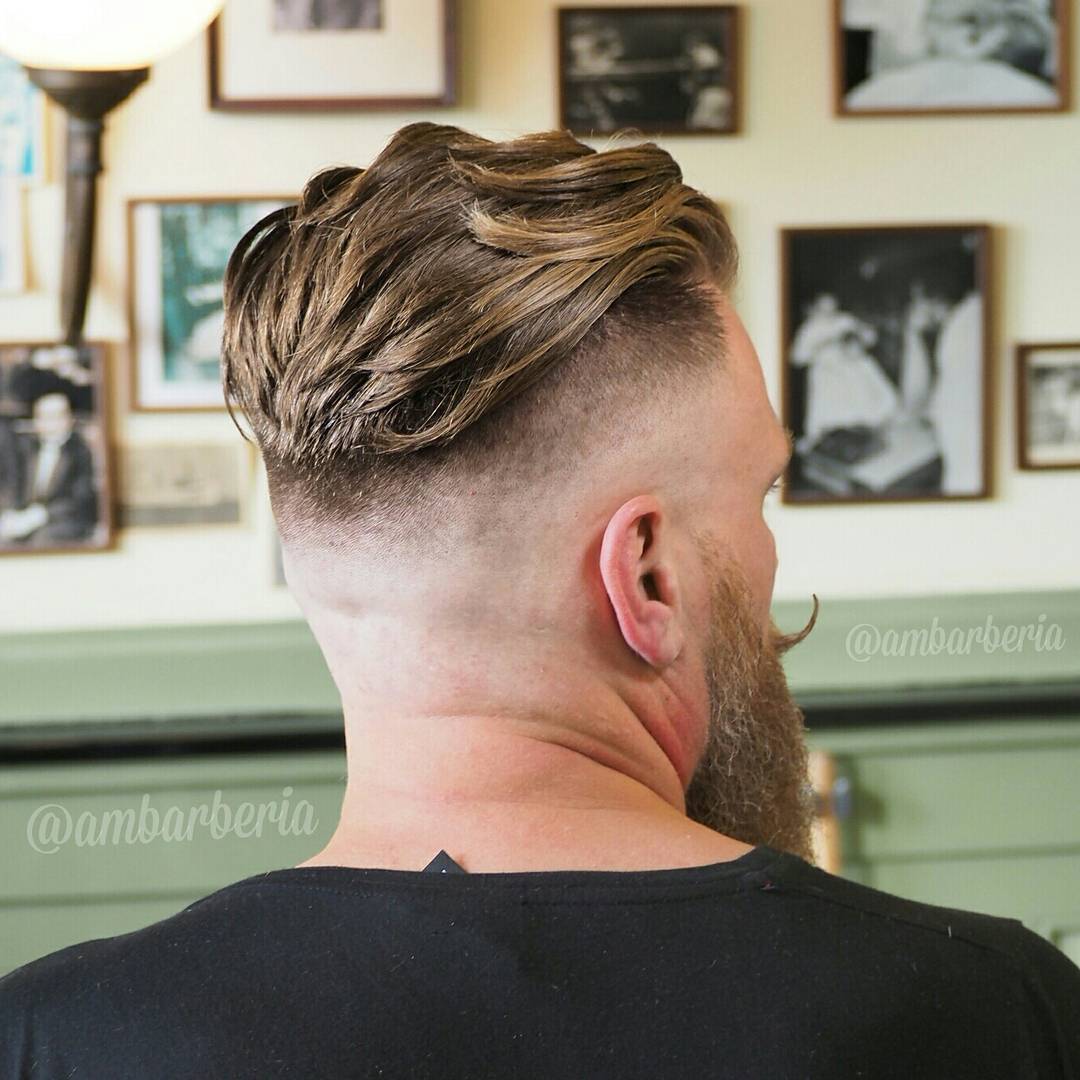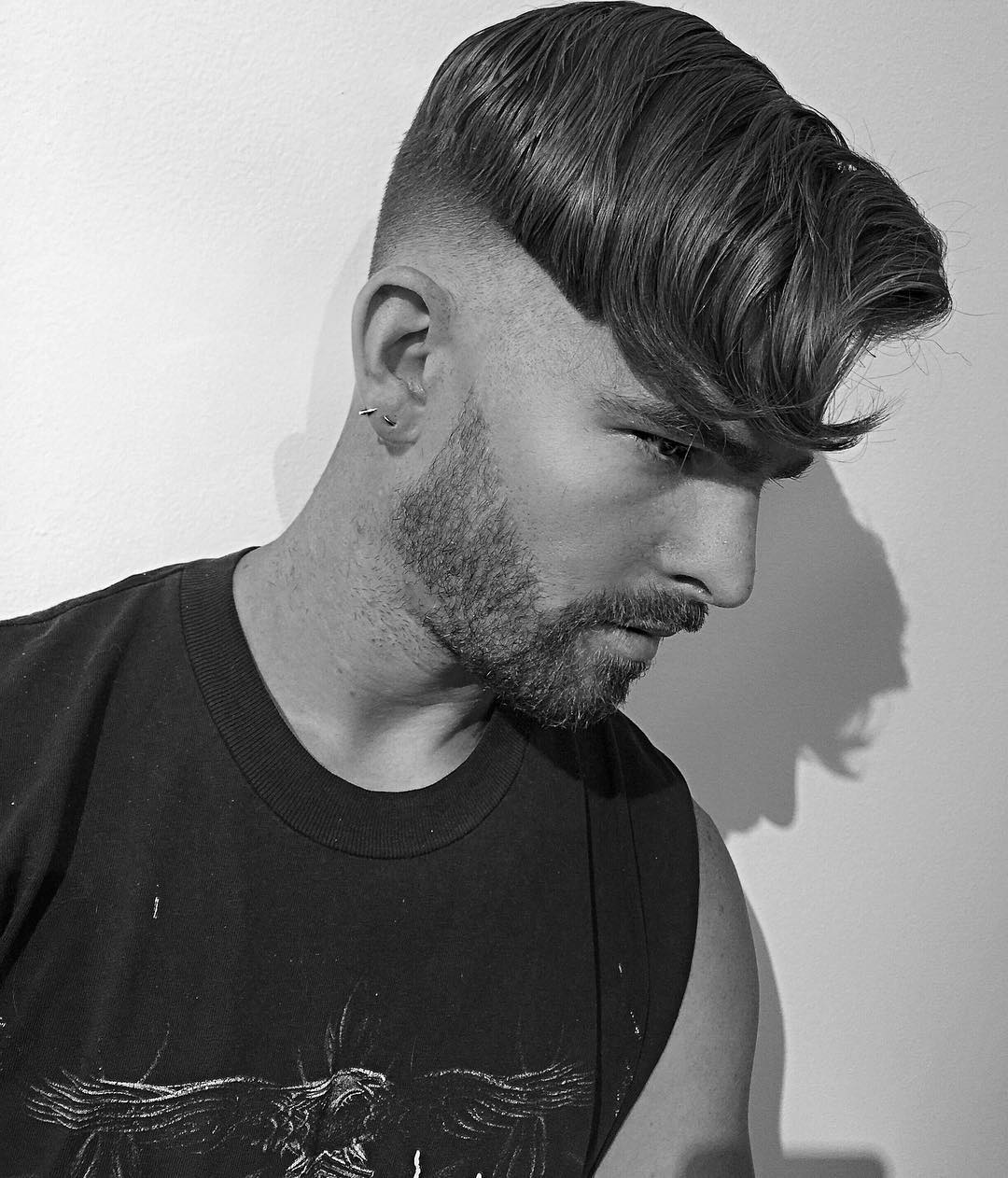 Un desvanecimiento calvo alto y una parte dura desconectan tanto la barba como la longitud del cabello más largo en la parte superior. El cabello se ha peinado hacia atrás de la cara en una especie de peine de pompadour sobre el peinado.