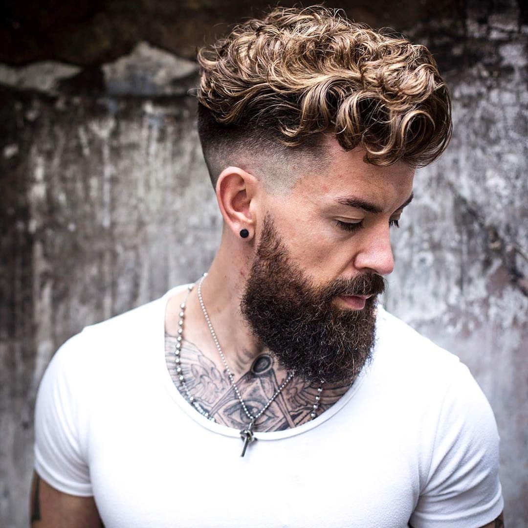Otra belleza pero con pelo rizado y barba. Tenemos un alto desvanecimiento de la piel que crea un fuerte contraste con el cabello grueso y rizado. Use una pomada de fijación media para darle a sus rizos más fuerza y ​​vida.