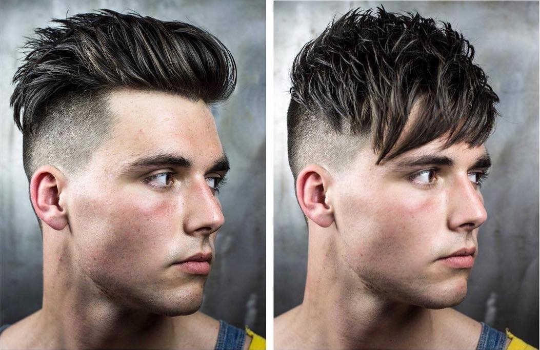 Una demostración perfecta de cuán versátil puede ser este corte de cabello cuando se trata de peinar. Aquí tenemos un corte de pelo diseñado de dos maneras muy diferentes. A la izquierda, el cabello tiene mucho volumen creado por un secador de pelo. Si tienes el cabello grueso como este chico, usa una pomada de fijación más fuerte y péinate el cabello de adelante hacia atrás para que luzca peinado hacia atrás. A la derecha, el cabello texturizado se peinó de atrás hacia adelante en una apariencia recortada y desordenada. ¡Dos peinados geniales para hombres! Esta toma moderna se llama atenuación socavada.