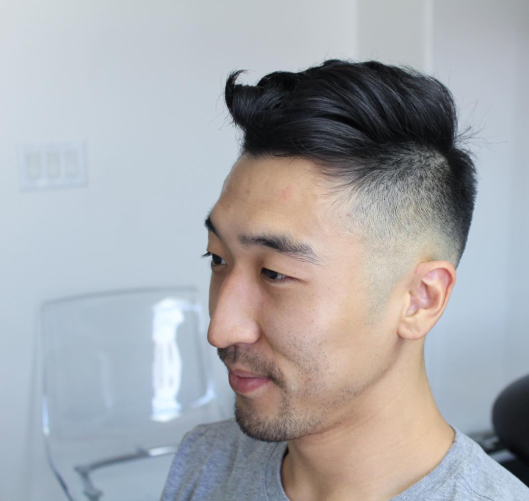 El desvanecimiento de la piel calva alta muestra el cabello negro y espeso en la parte superior que está peinado en ondas de aspecto fresco o una versión del peinado combover quiff.