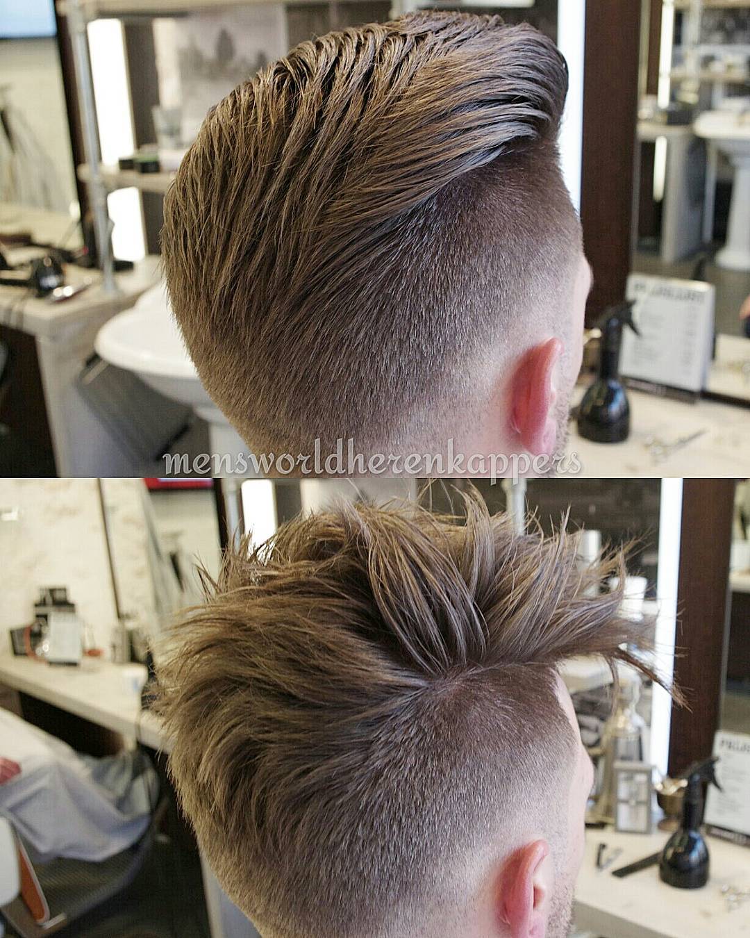 En el pasado, estos cortes de cabello para hombres eran muy sencillos y eran más un tipo de peinado de bricolaje en casa. Este corte de pelo clásico para hombres se logra simplemente zumbando los lados y la parte posterior en una longitud (muy corta) con tijeras. Luego corte el cabello en la parte superior con unas tijeras a la longitud deseada y deslícelo hacia atrás.